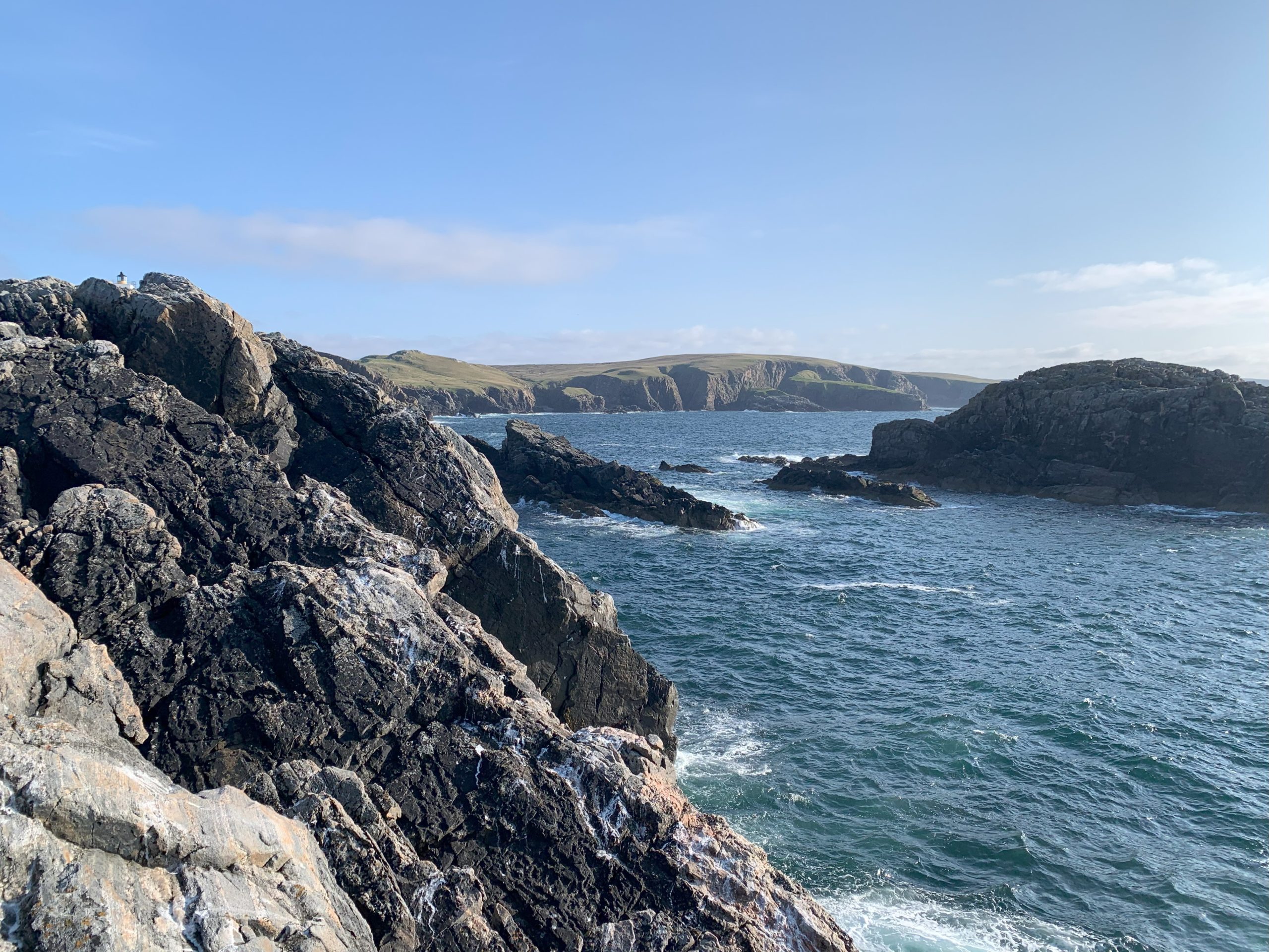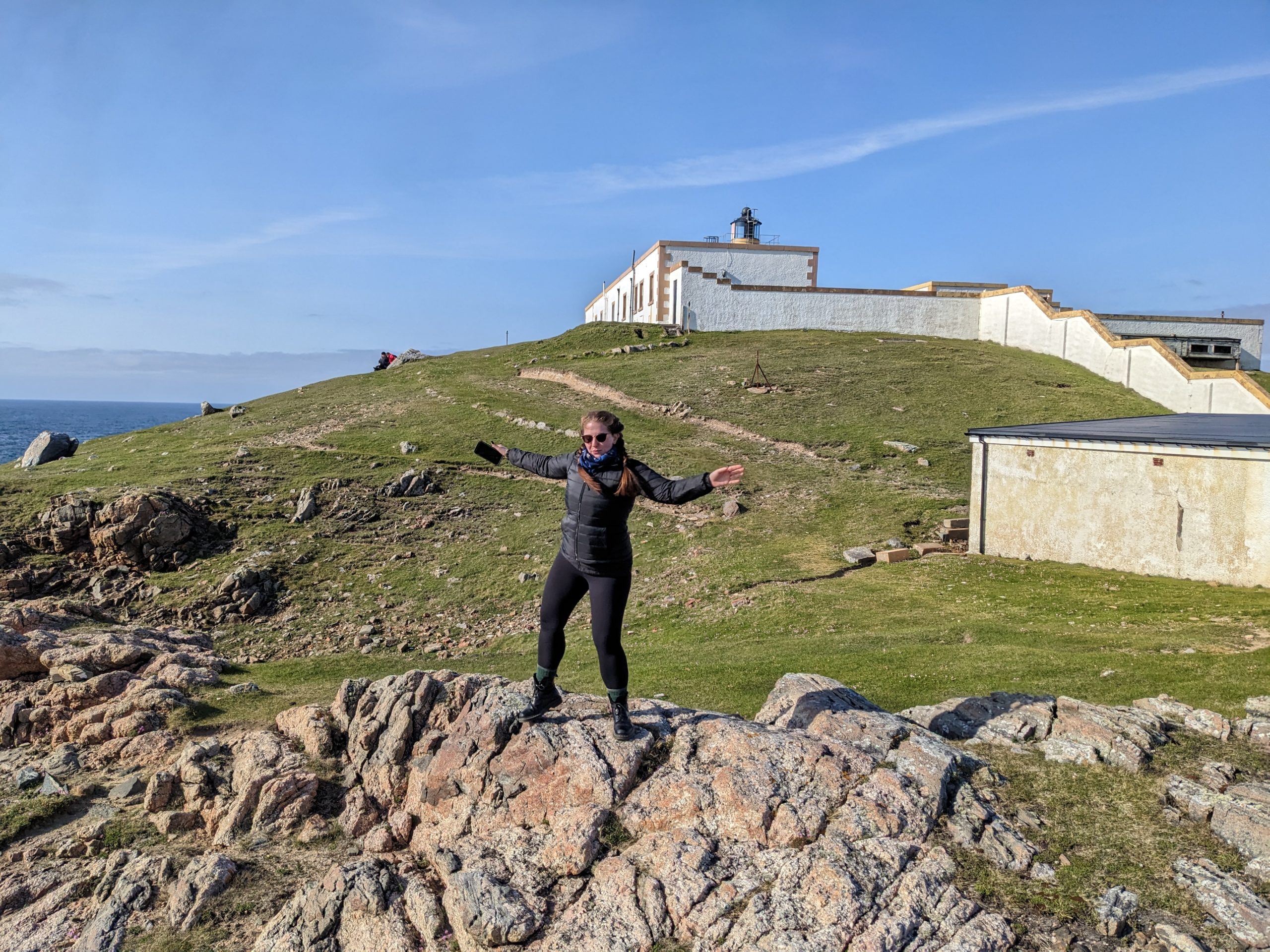 The route got more interesting once we rounded the corner at John O’Groats. The skies got darker and the wind chillier, but we avoided any rain as we made our way to west towards Strathy, about the half-way point of the north coast. We’d booked a room in a converted lighthouse, and our arrival around 6pm gave us several hours to explore the expansive grounds and rock-scramble our way out onto the rocks that jutted into the North Sea.