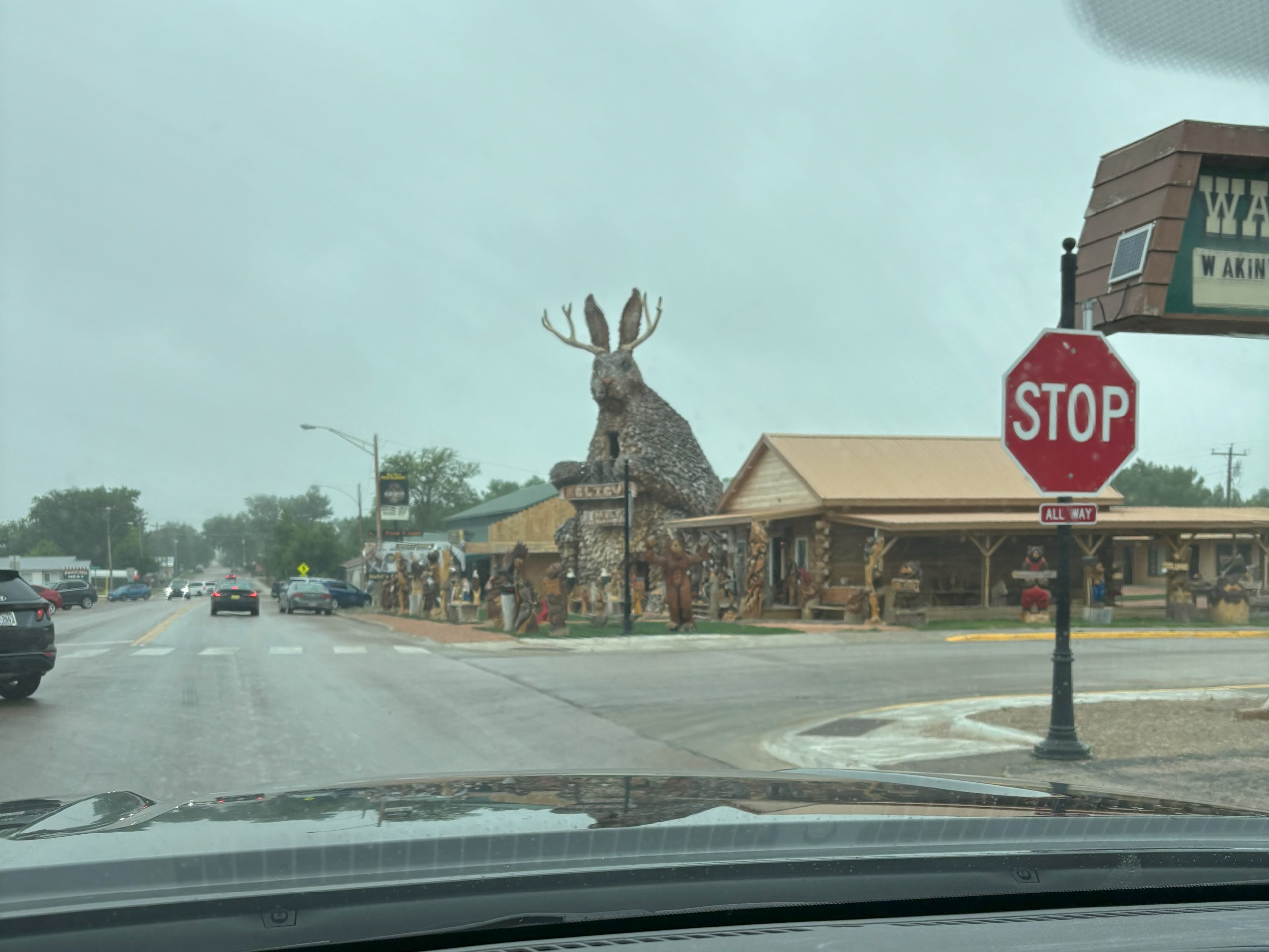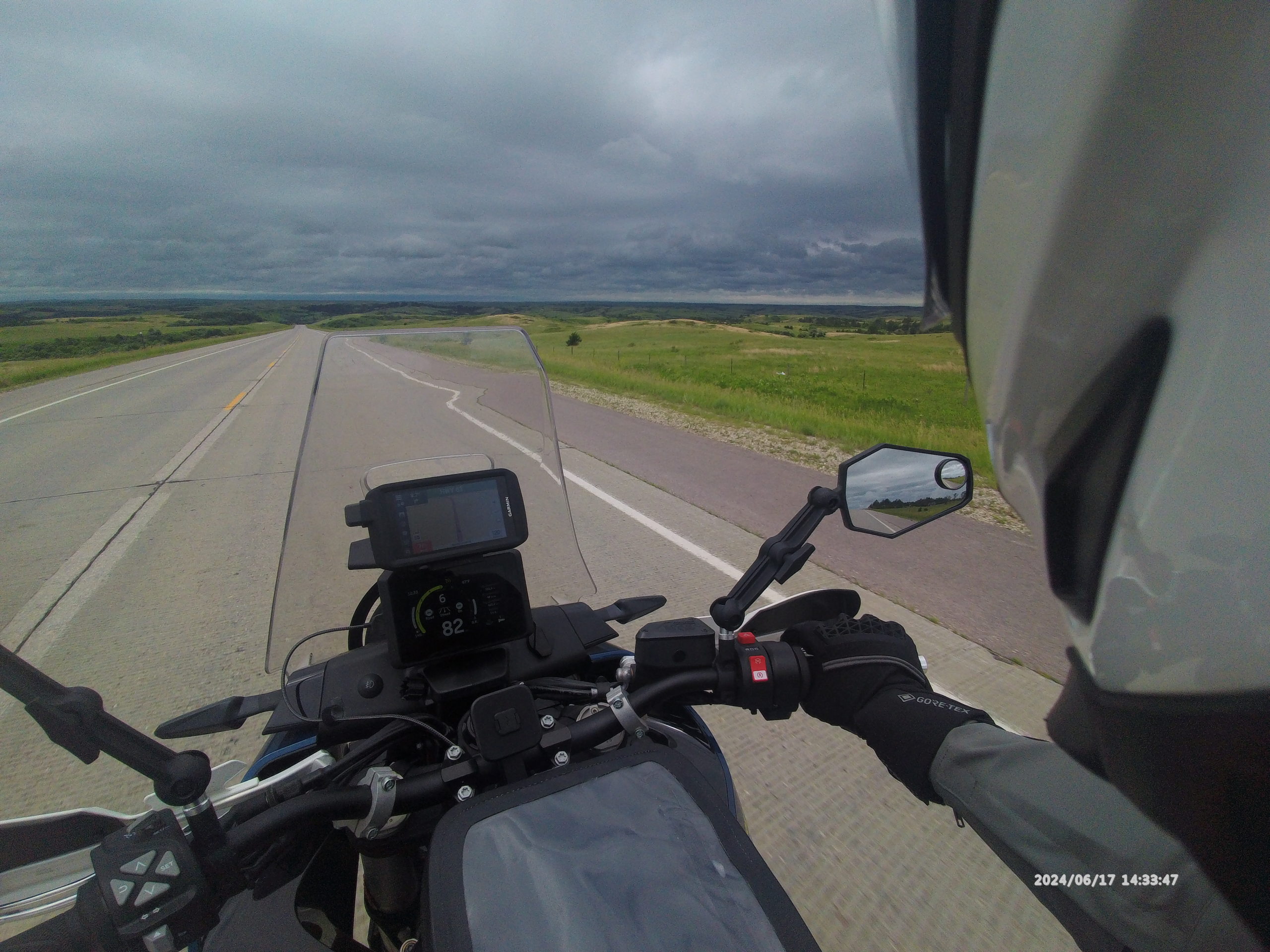 Checking the weather in Tea got us a bit worried for the final ride into Wall. It was my last chance to get to 600 miles for my first service, so I was riding the 330 final miles no matter what. The forecast was calling for heavy thunderstorms for the first half of the ride so Tori agreed to drive chase in the truck. That made both of us feel better in case I got soaked or needed shelter from the potentially heavy winds and hail. The first hour was drizzly off and on and we did finally hit a pretty heavy cell just before Platte, SD. My Aerostich RoadCrafter suit did a pretty good job, but I still ended up damp around the neck and waist where the water seeped in at the hem of the jacket. After a maybe 30 miles we broke through the other side of the storm and stopped to reevaluate. Since the radar was more clear for the rest of the day, Tori split off for I-90 to make sure she made it to the airport in time to grab Dorothy.