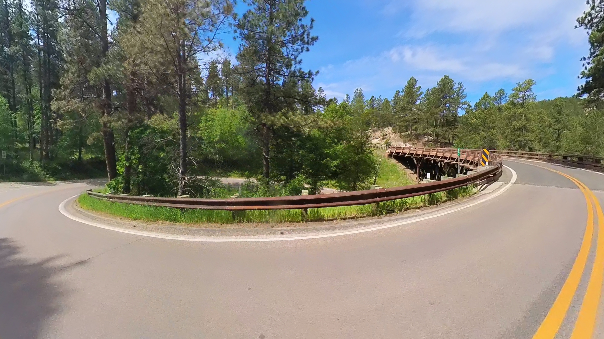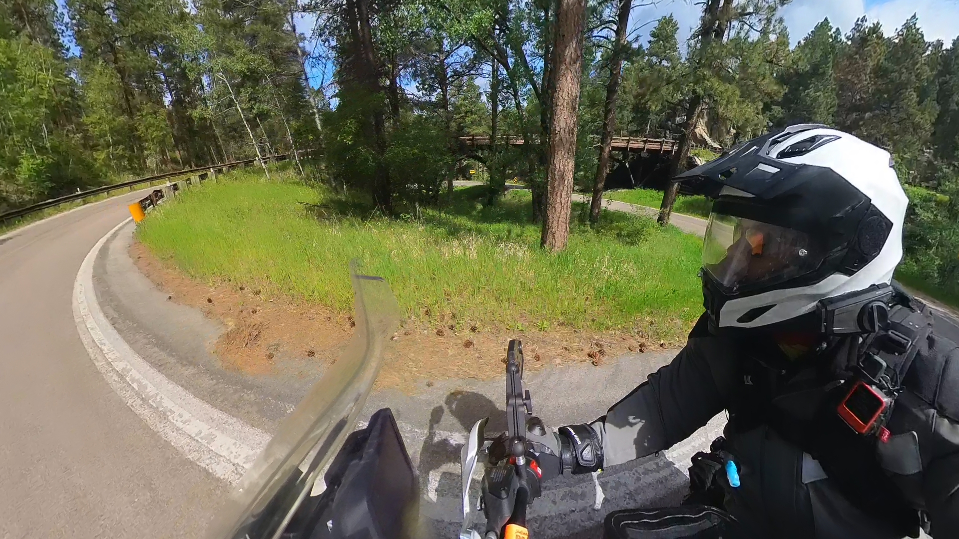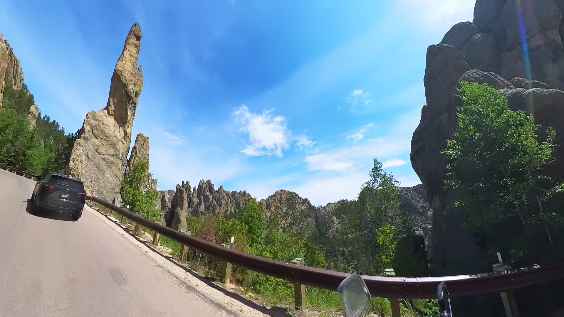 The route swung north after the Badlands, and after stopping for a moment in Rushmore to add a few layers (it was only about 50 degrees all morning) it entered into the Black Hills. The roads and scenery were incredible, with shear cliffs, narrow tunnels, tons of switchbacks, and crazy rock formations. I can’t wait to edit together the videos for this section since there was no way to capture the scale of elevation changes and tightness of the roads in still photos.