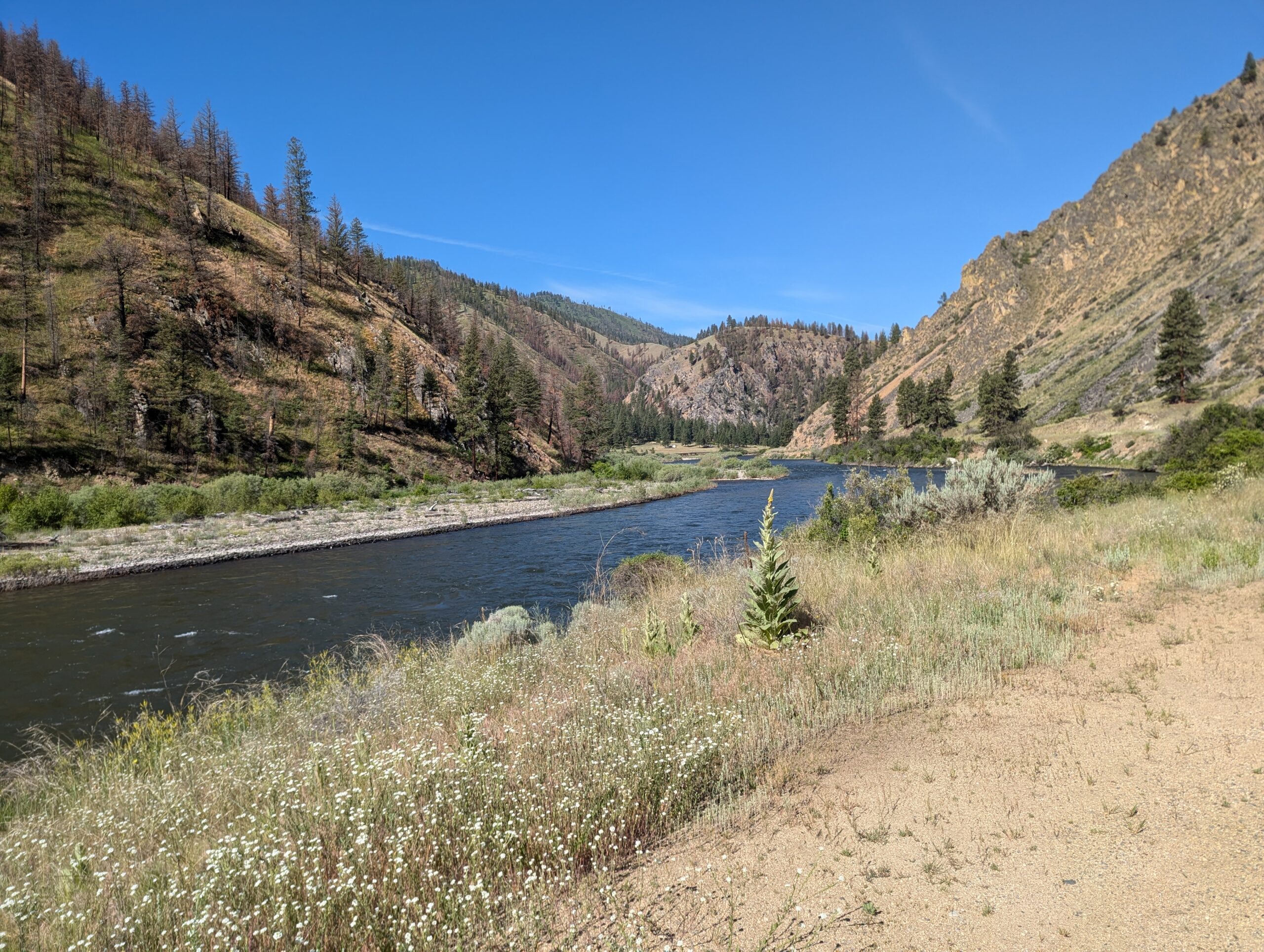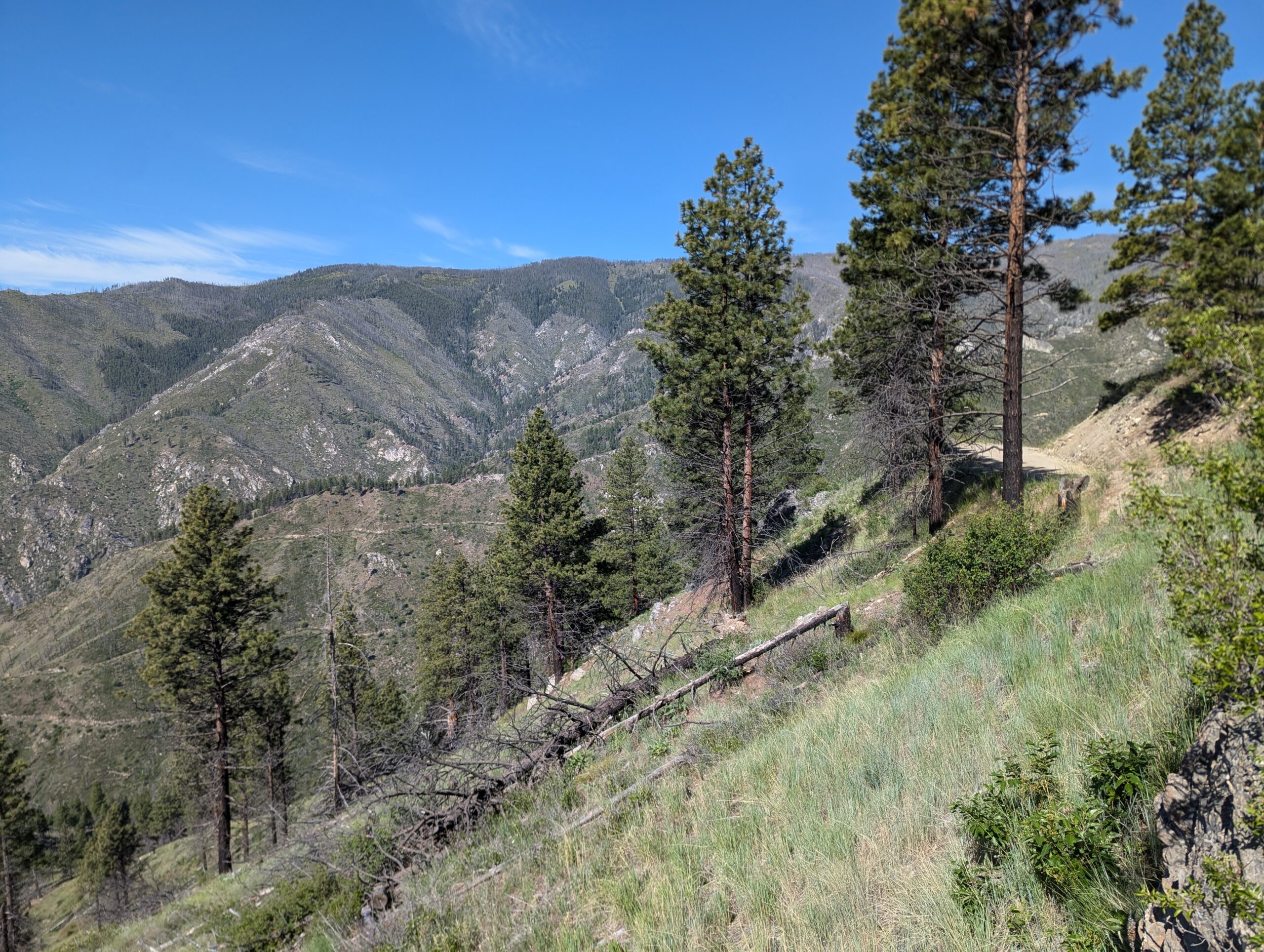 The road was well groomed gravel with the occasional deep spot and corrugations on the hills. After a a couple miles of slow warm-up, the road rose up the mountain faces with a series of steep switchbacks and staggering views of the Salmon River and surrounding valleys.