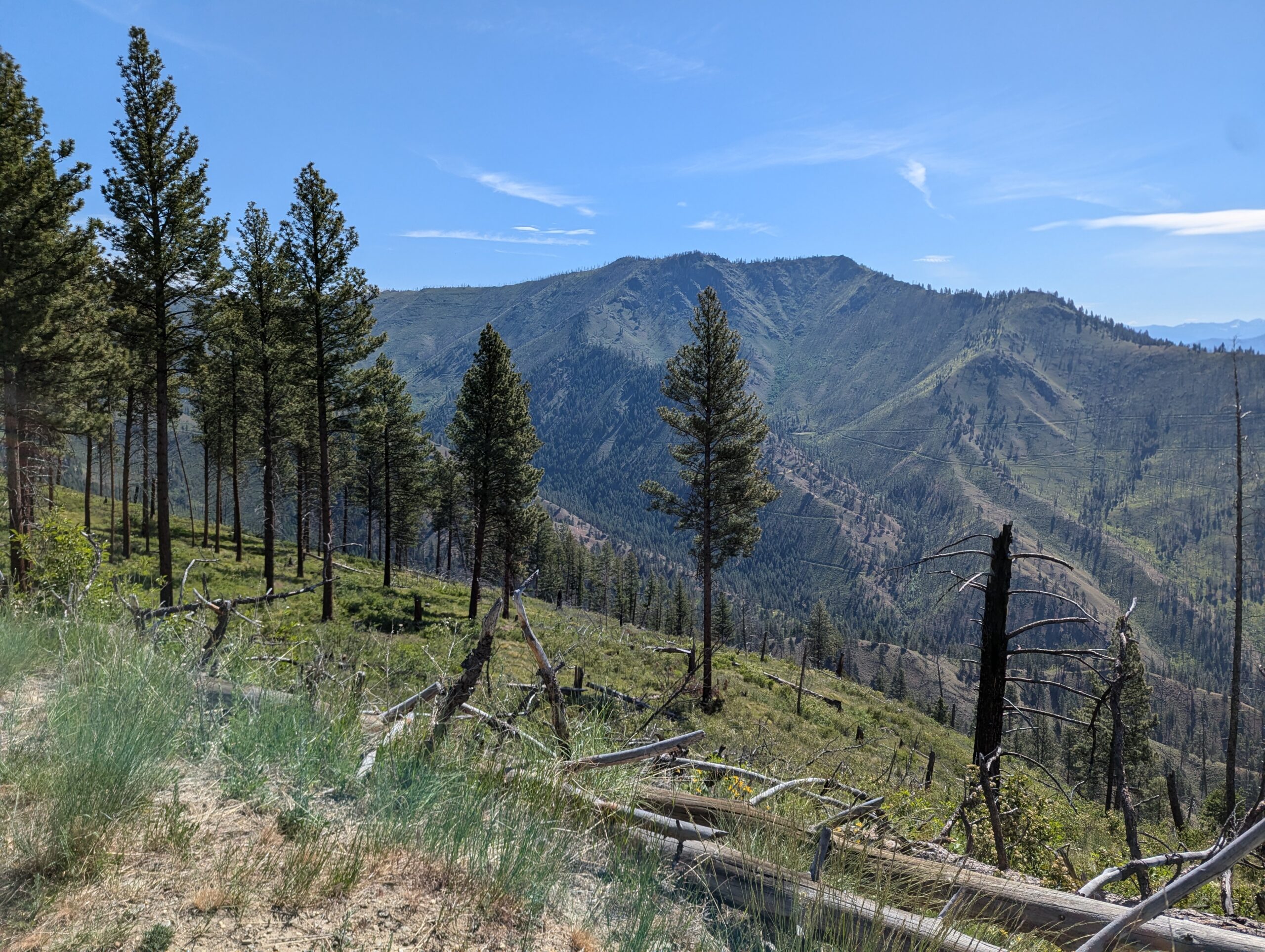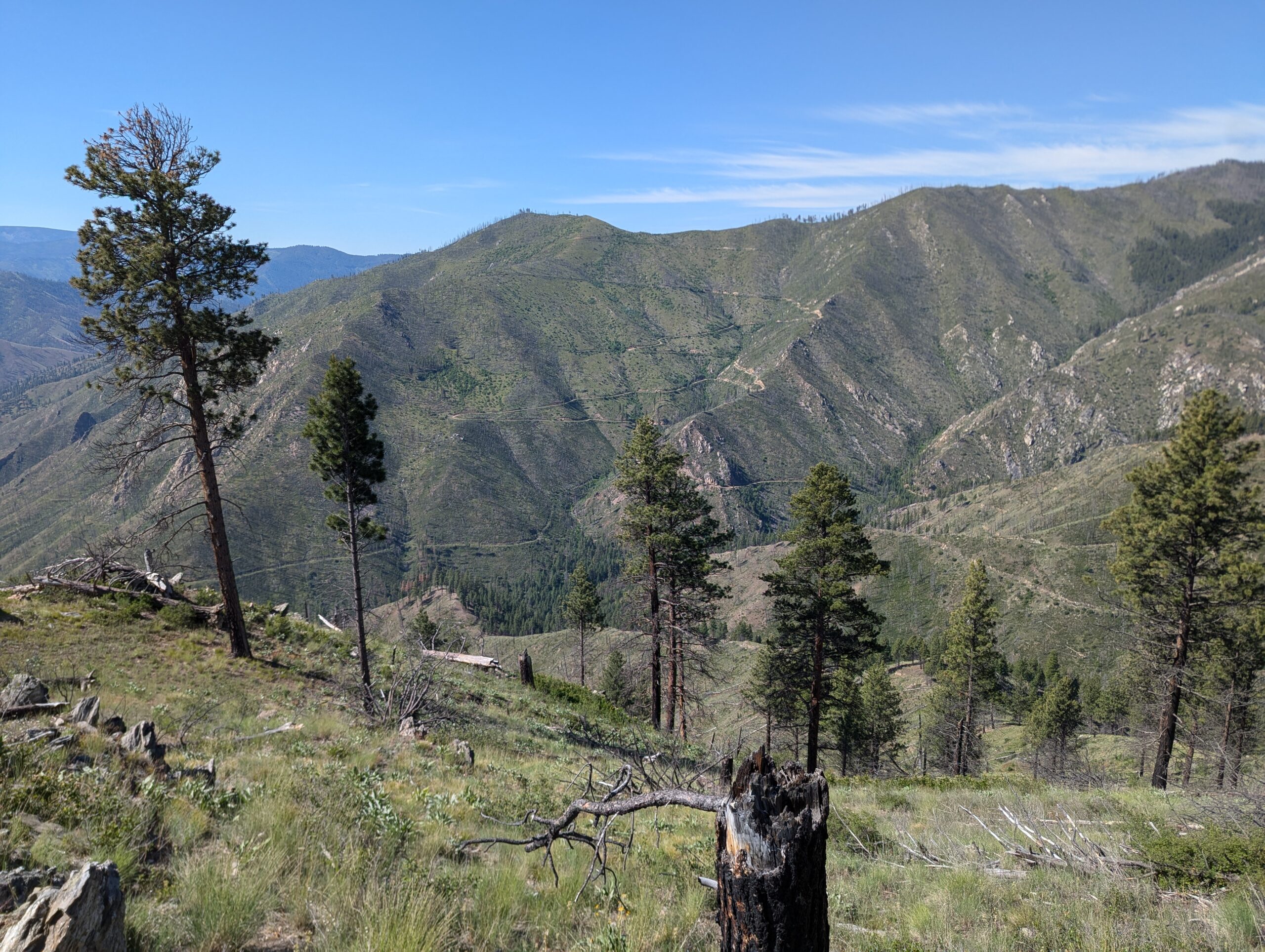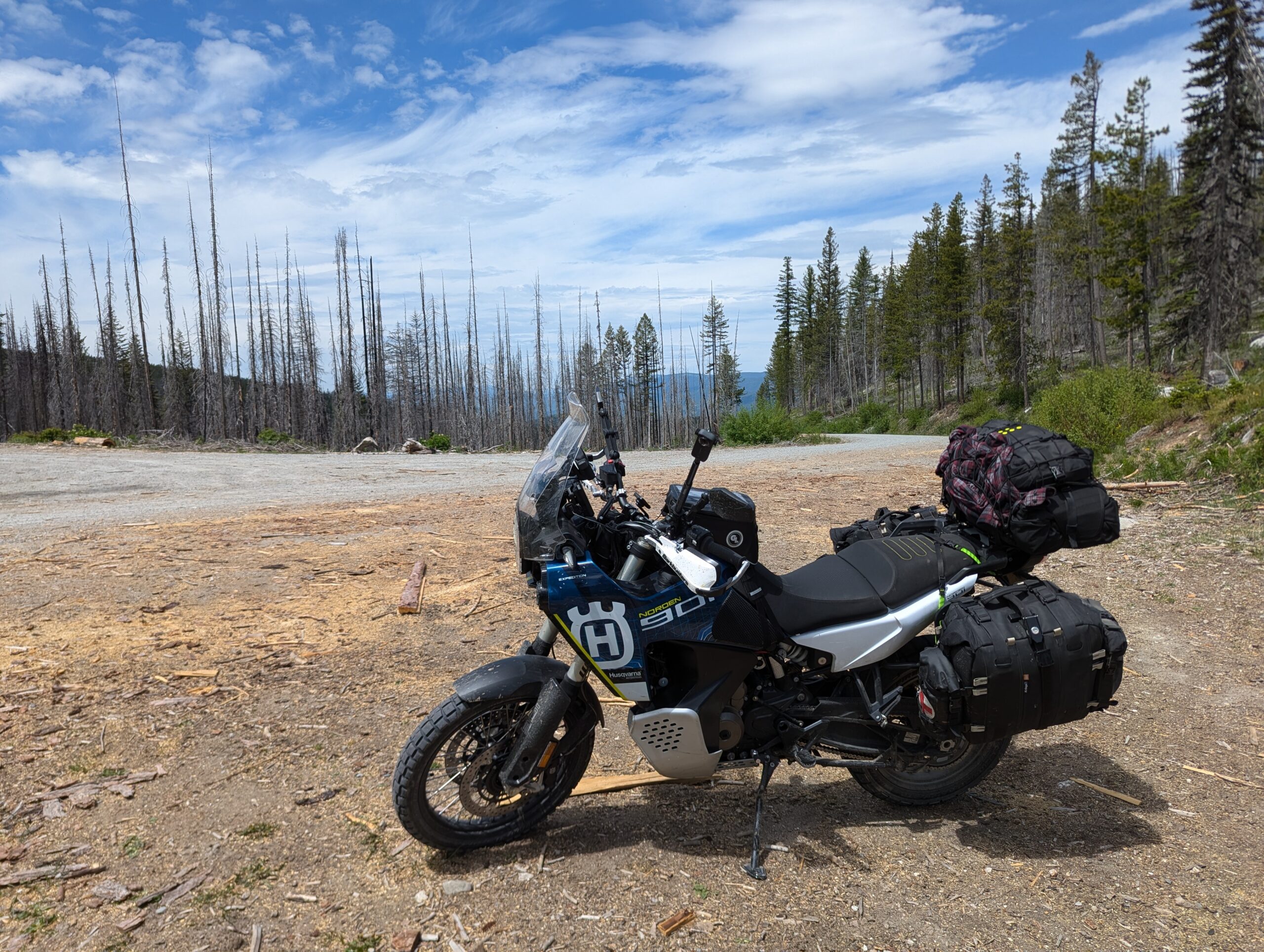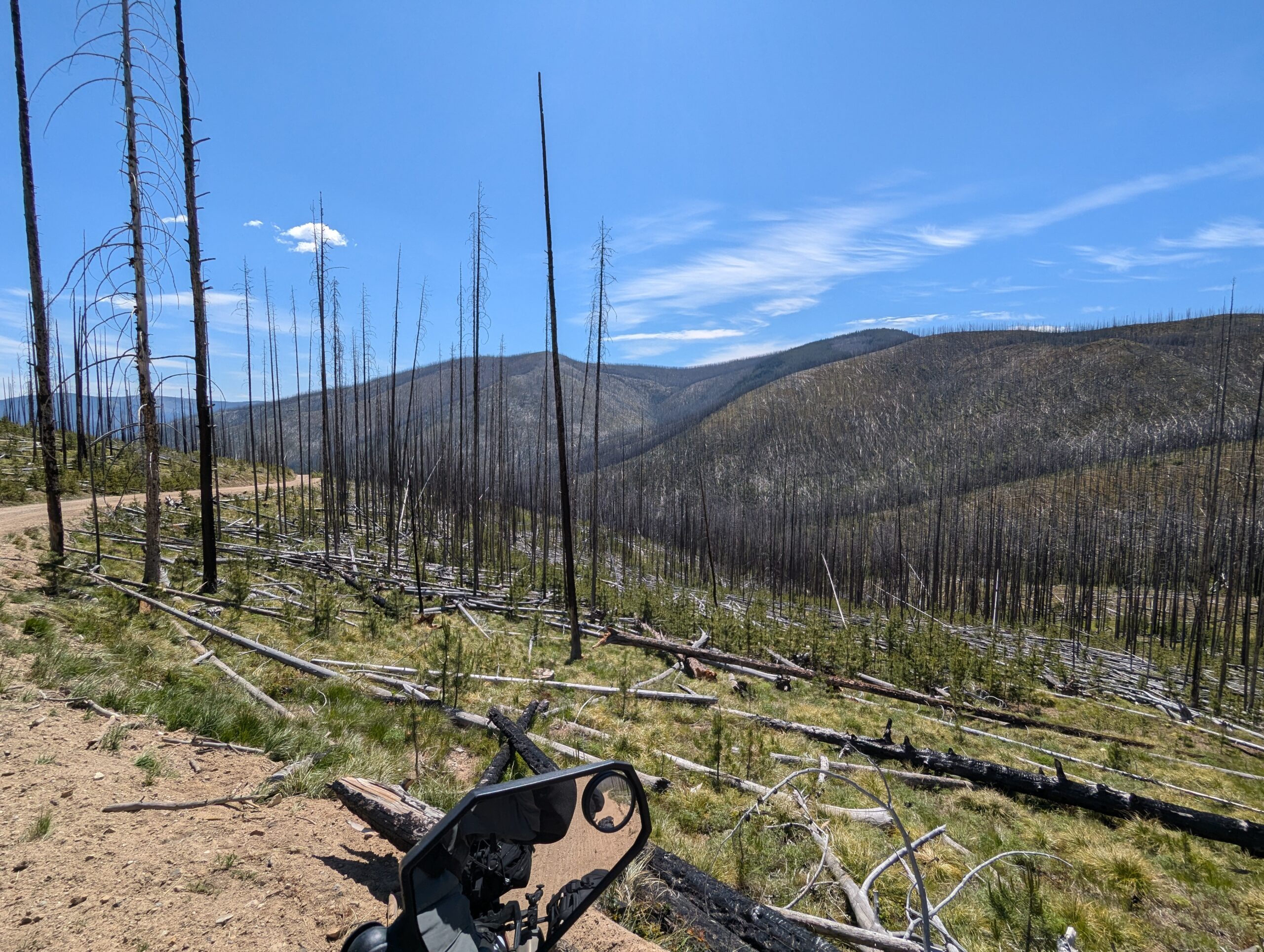 Once the road reached the summit, it following a ridge line north from peak to peak. Each summit revealed more mountains and an increasing amount of wild fire damage. When I stopped for a drink and to take off my mid-layers, a local ATV rider and his very floofy German Shepherd stopped by to check on me and give me some pointers on local landmarks and history.