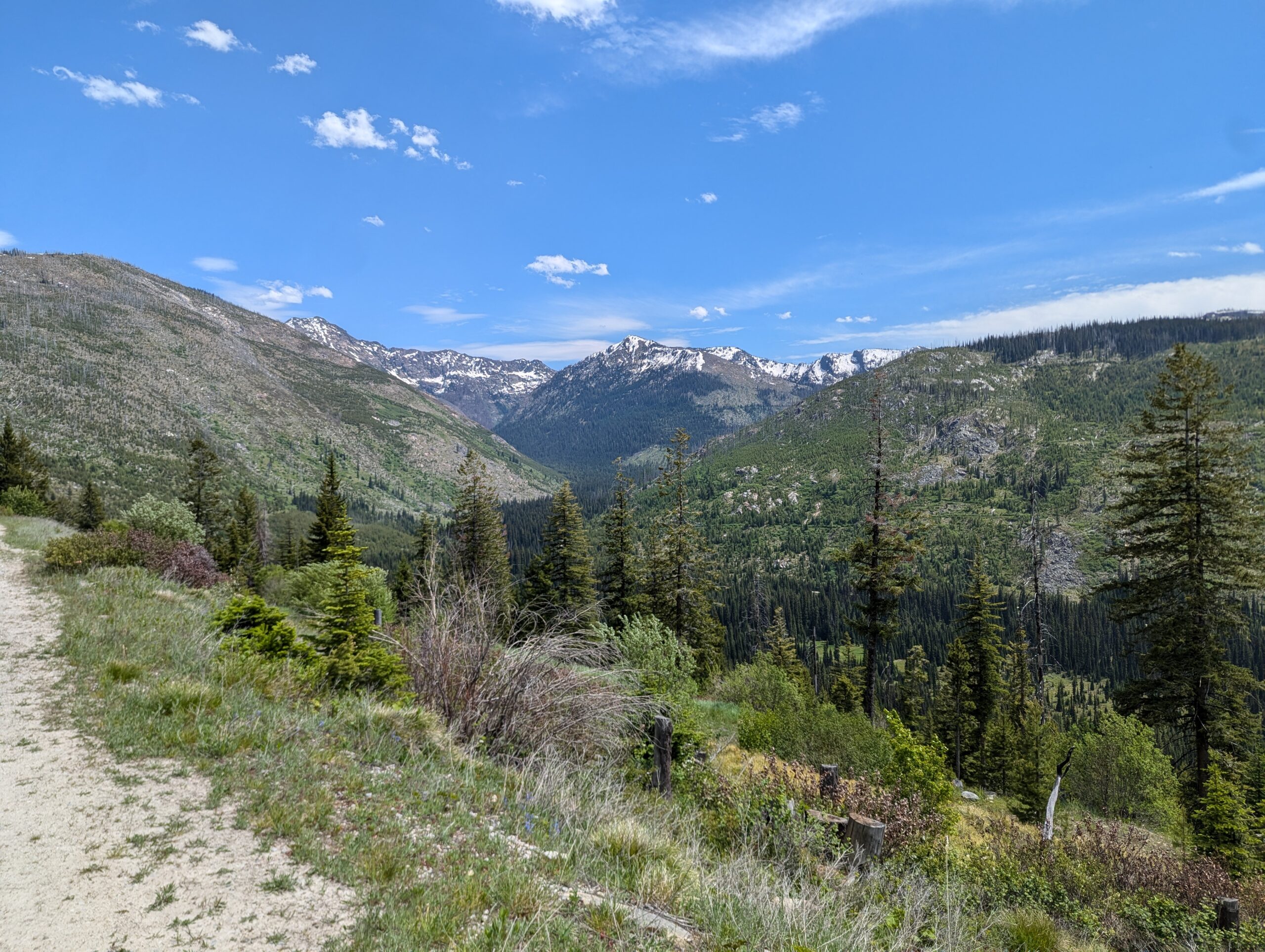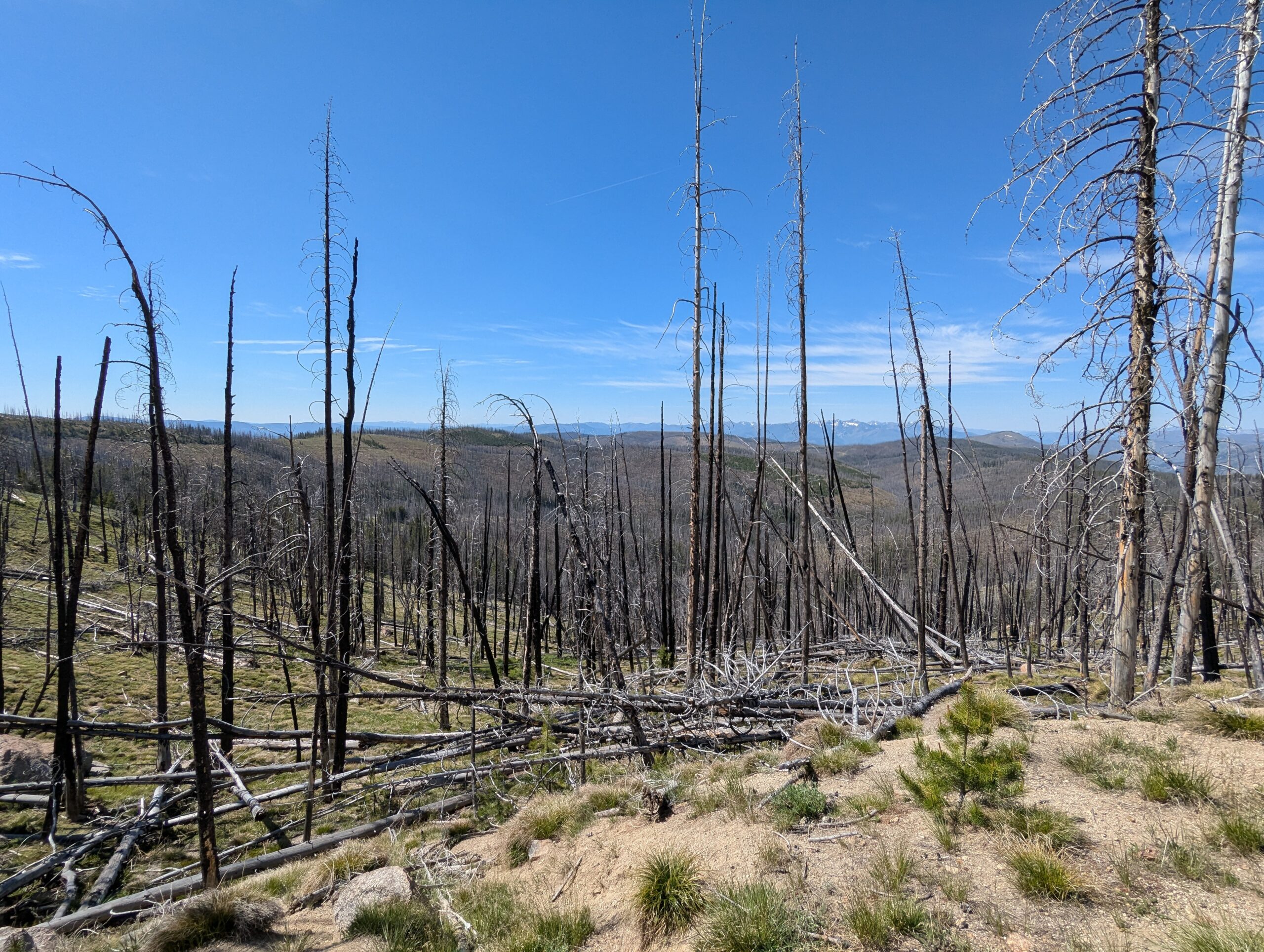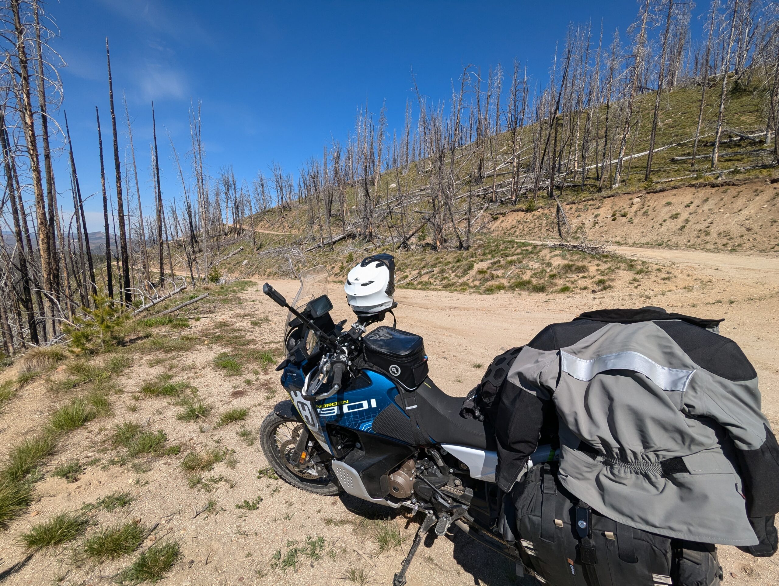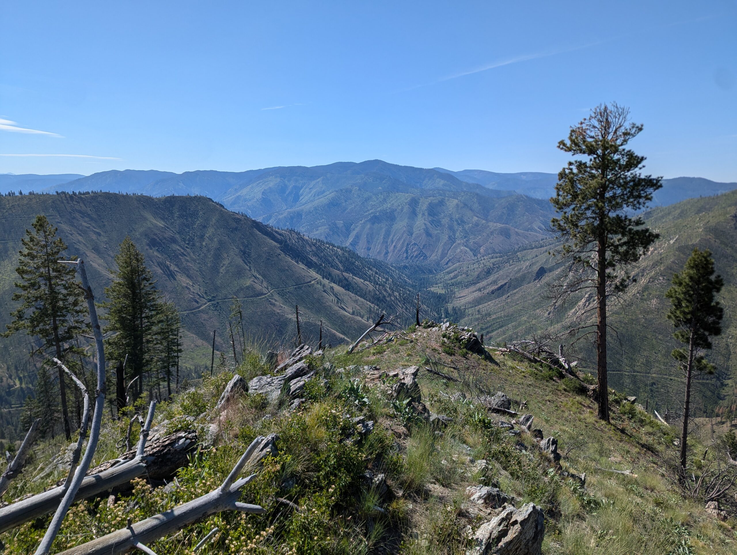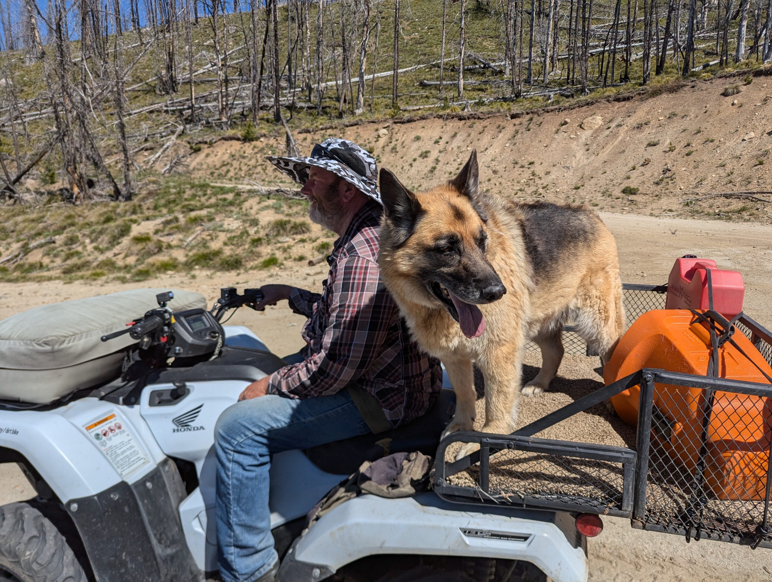 Once the road reached the summit, it following a ridge line north from peak to peak. Each summit revealed more mountains and an increasing amount of wild fire damage. When I stopped for a drink and to take off my mid-layers, a local ATV rider and his very floofy German Shepherd stopped by to check on me and give me some pointers on local landmarks and history.