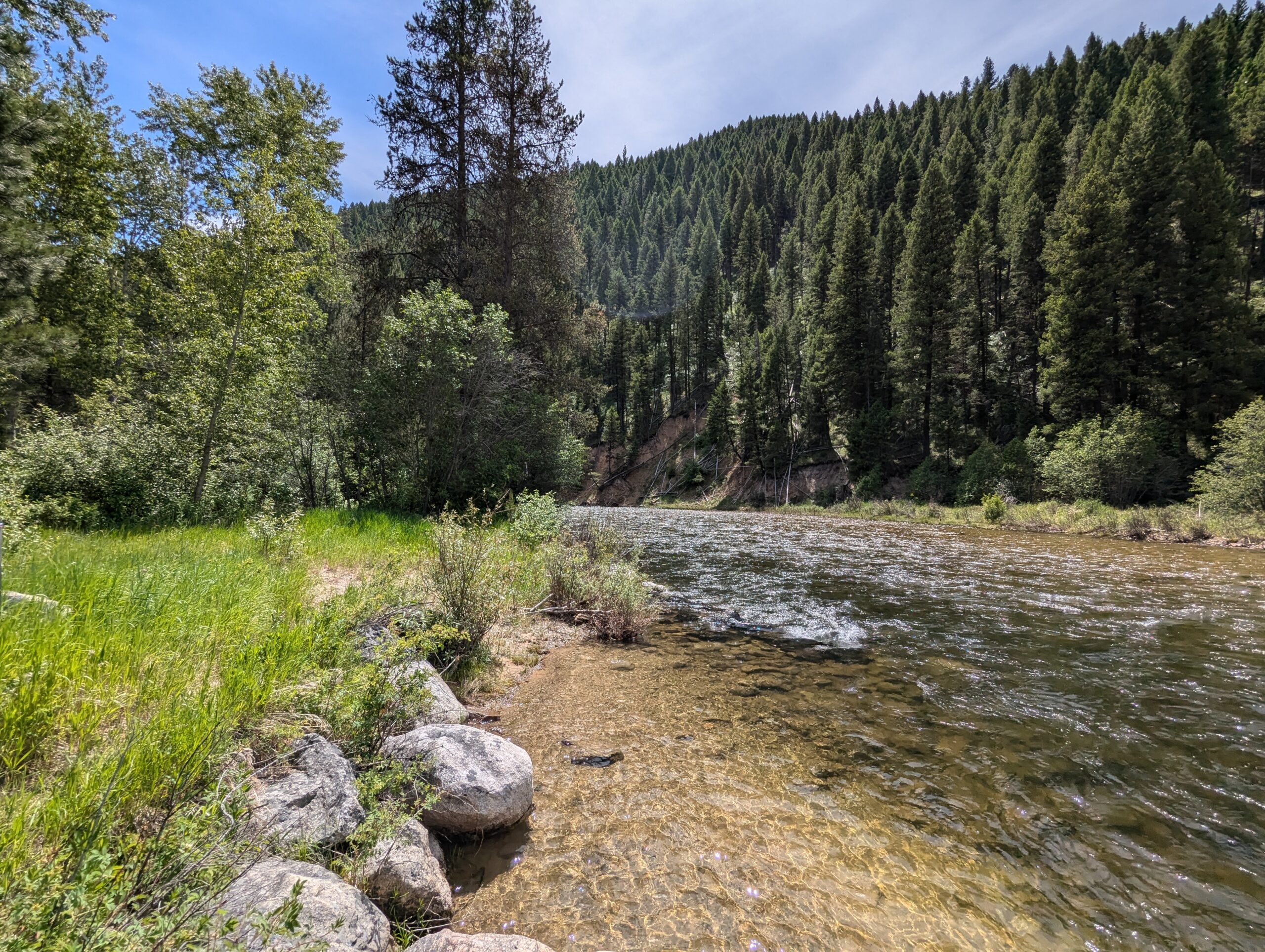 Heading out of my yurt at the River’s Fork Lodge (after waiting for the day to warm up with a breakfast burrito and coffee), I gassed up and headed straight into the Salmon-Challis National Forest around 9:30. The forest service road follows the Salmon River for few miles with sheer cliff faces boxing in the narrow river valley, but eventually the cliff walls opened up and there as a pass into the mountains.