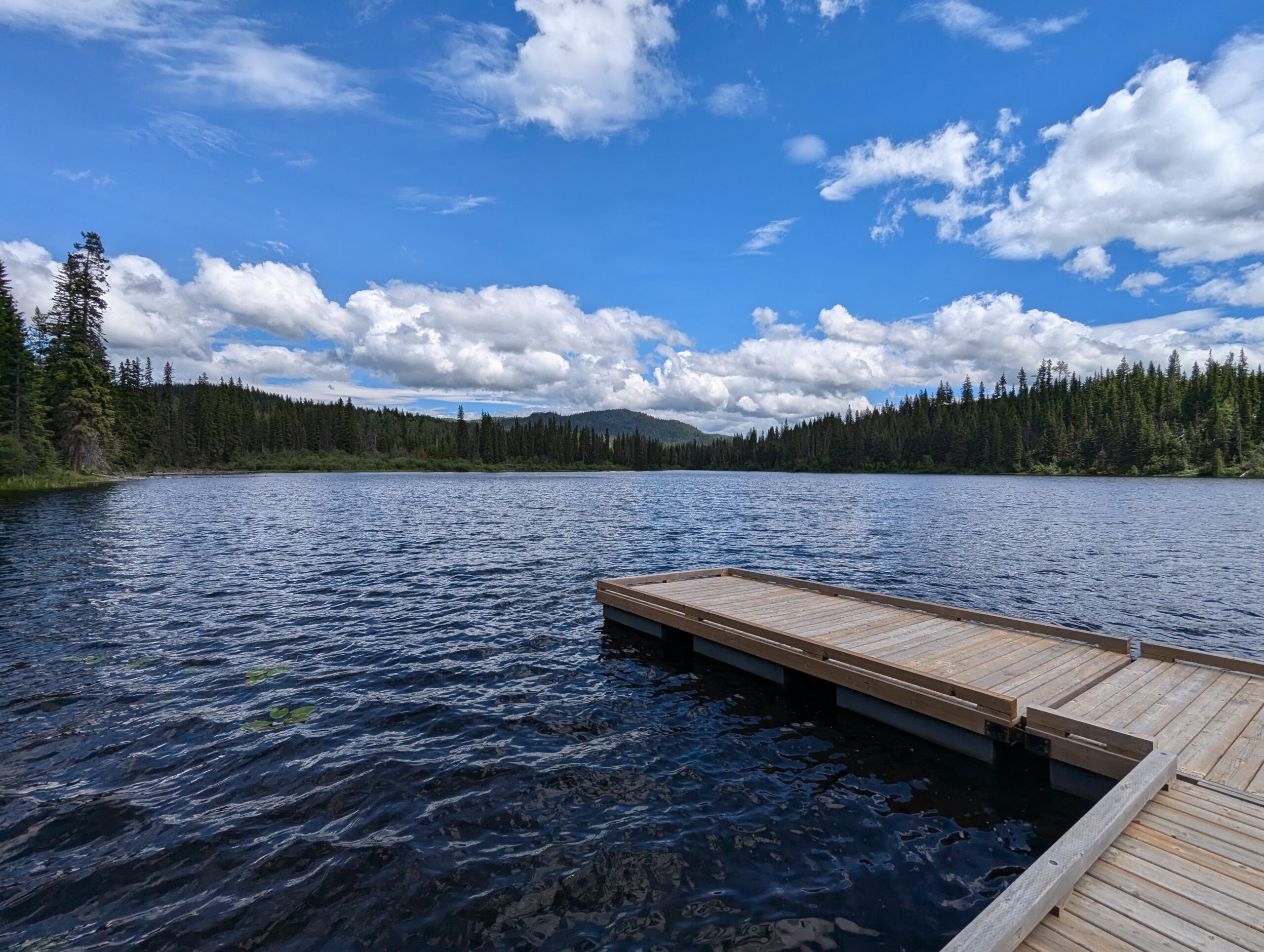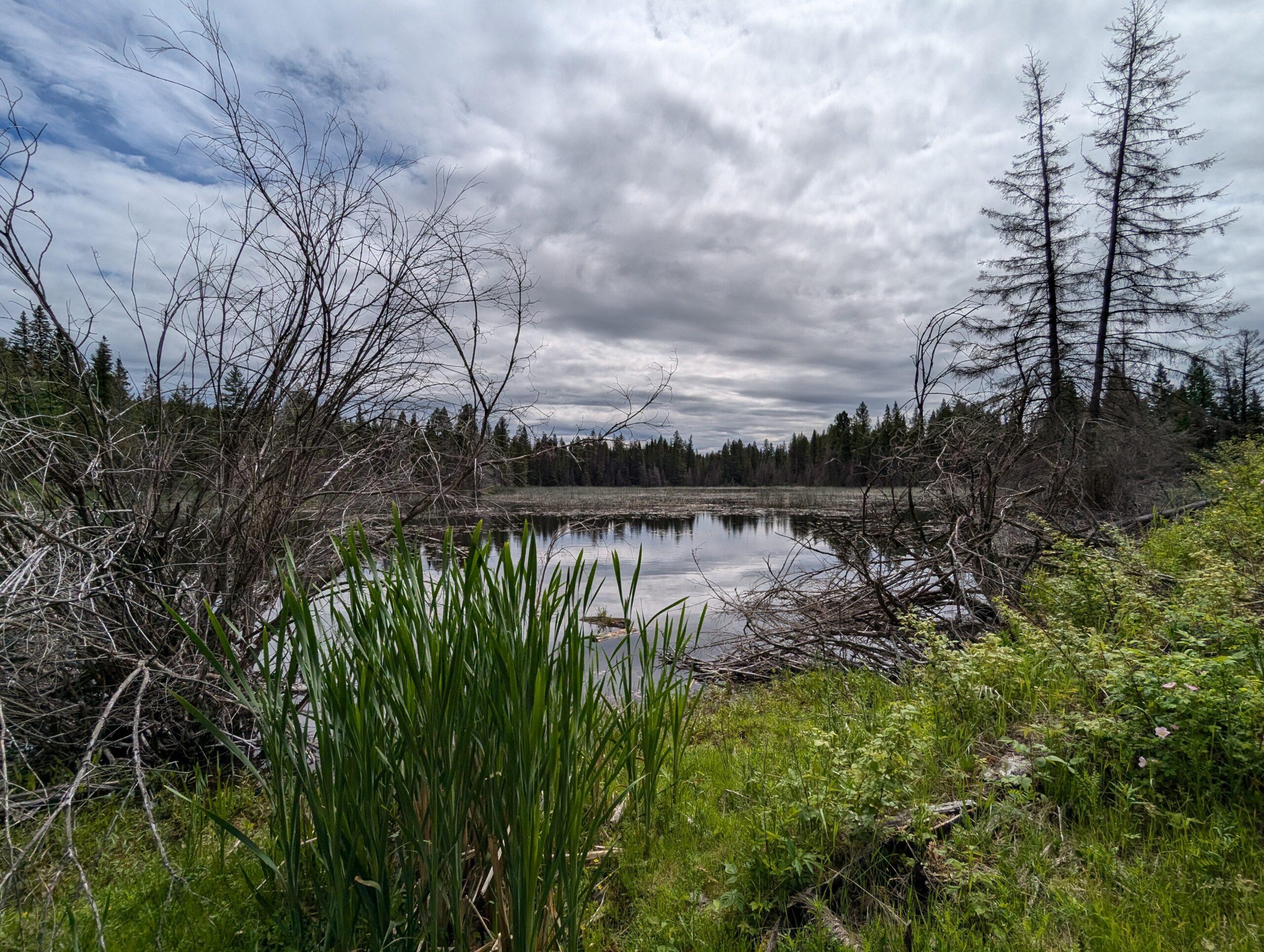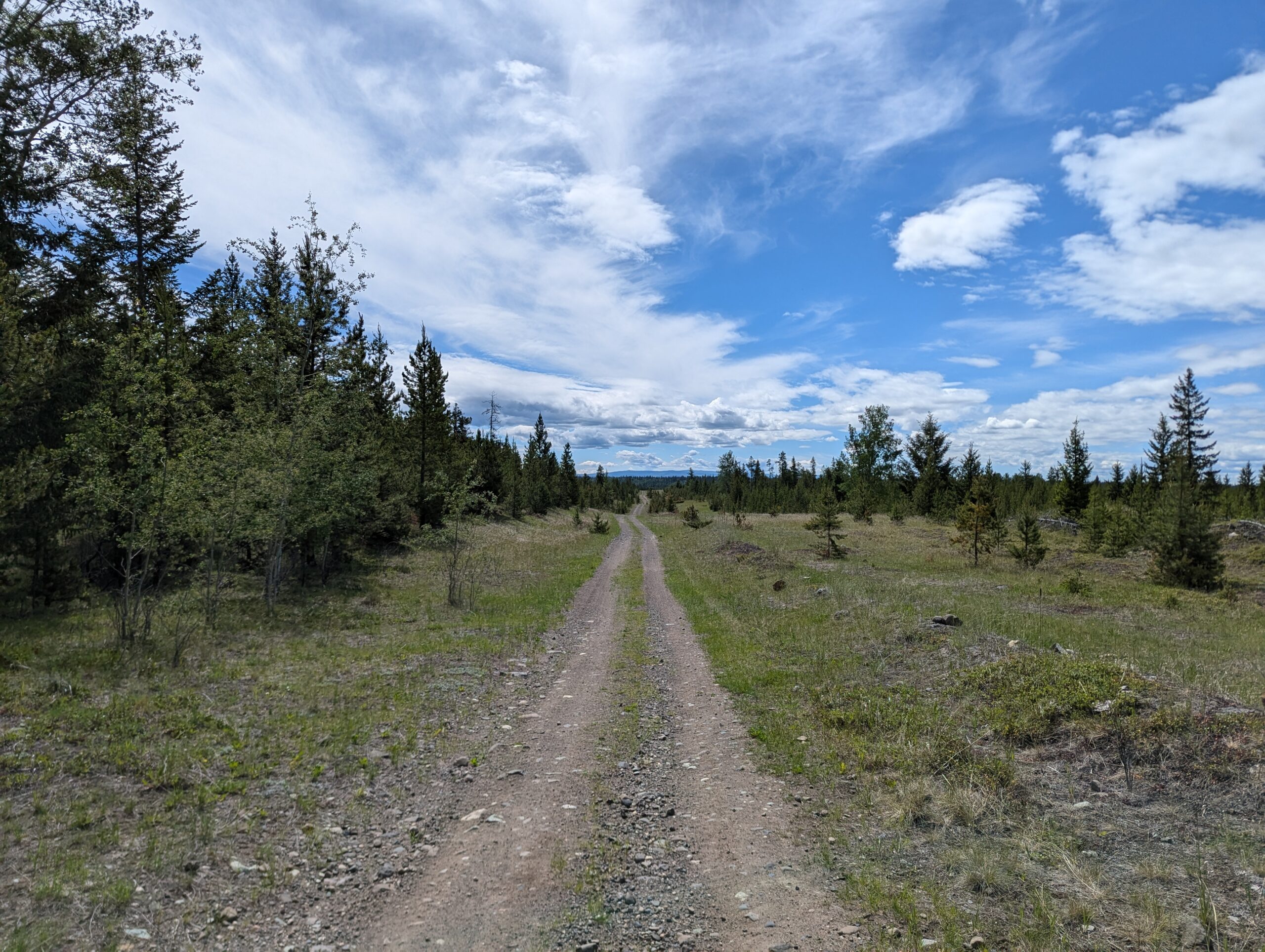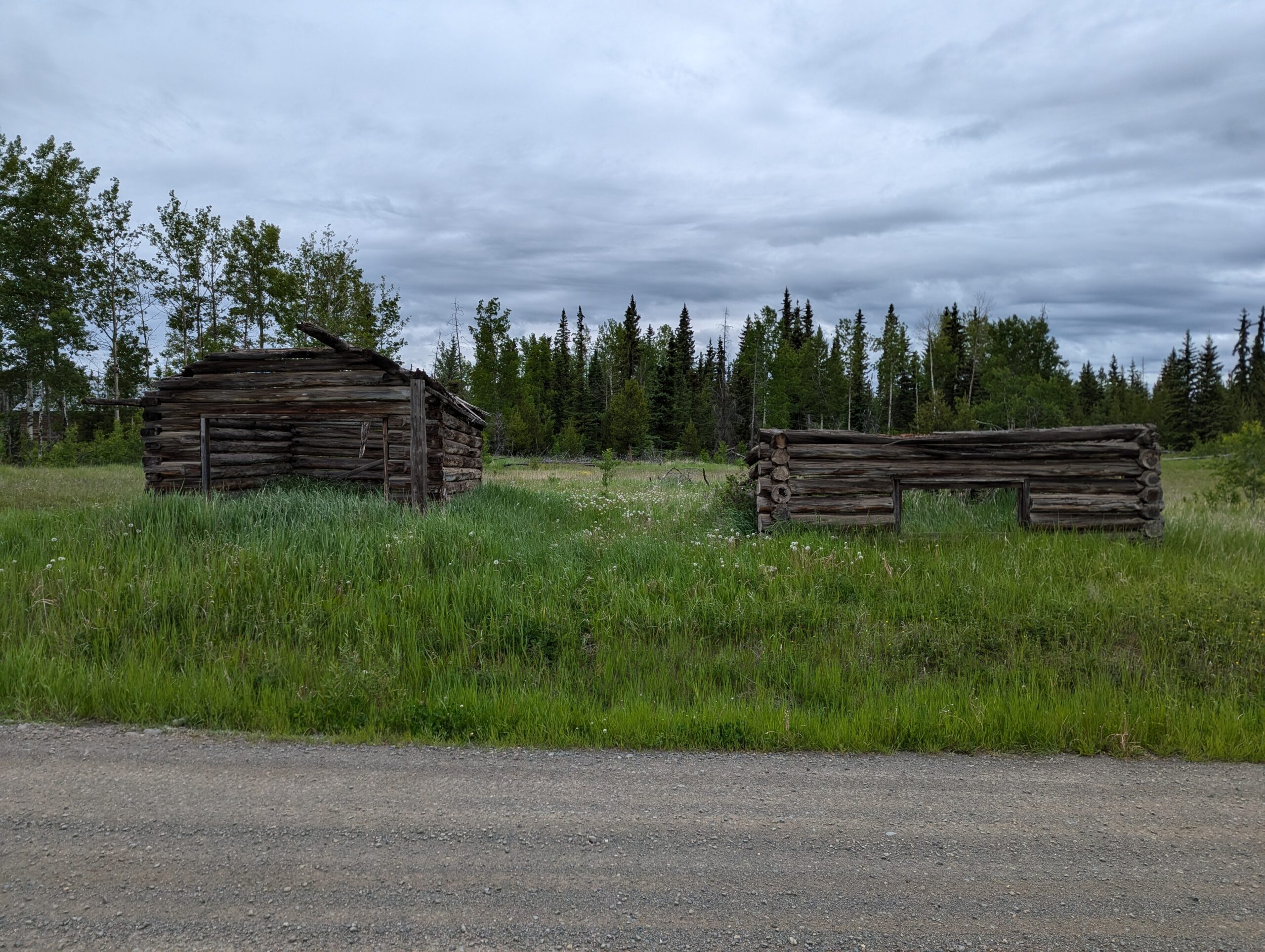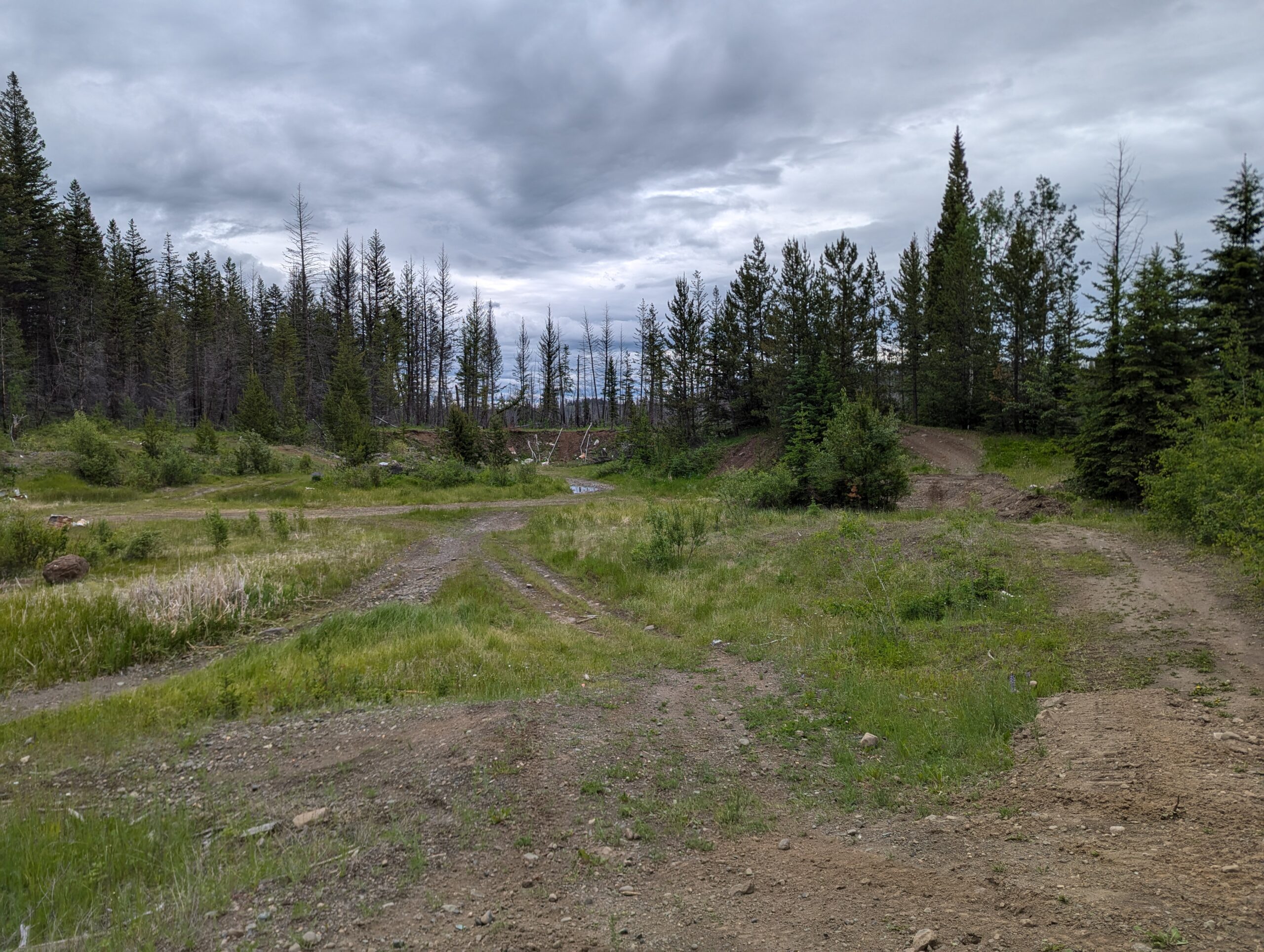 The forecast looked gloomy but with little chance of rain when I took off around 10am for McLeese Lake. My route had about 300km planned with a decent chunk of it on unpaved forest service roads. Before leaving Sheridan Lake, I managed to find an access road that let me sneak between houses and actually see the lake itself. The rest of the morning was on wide, well groomed forest service roads with some washboard and potholes but nothing bad. There were a few sections where kids had built up little offroad tracks and couple of cool abandoned farm/ranch buildings.
