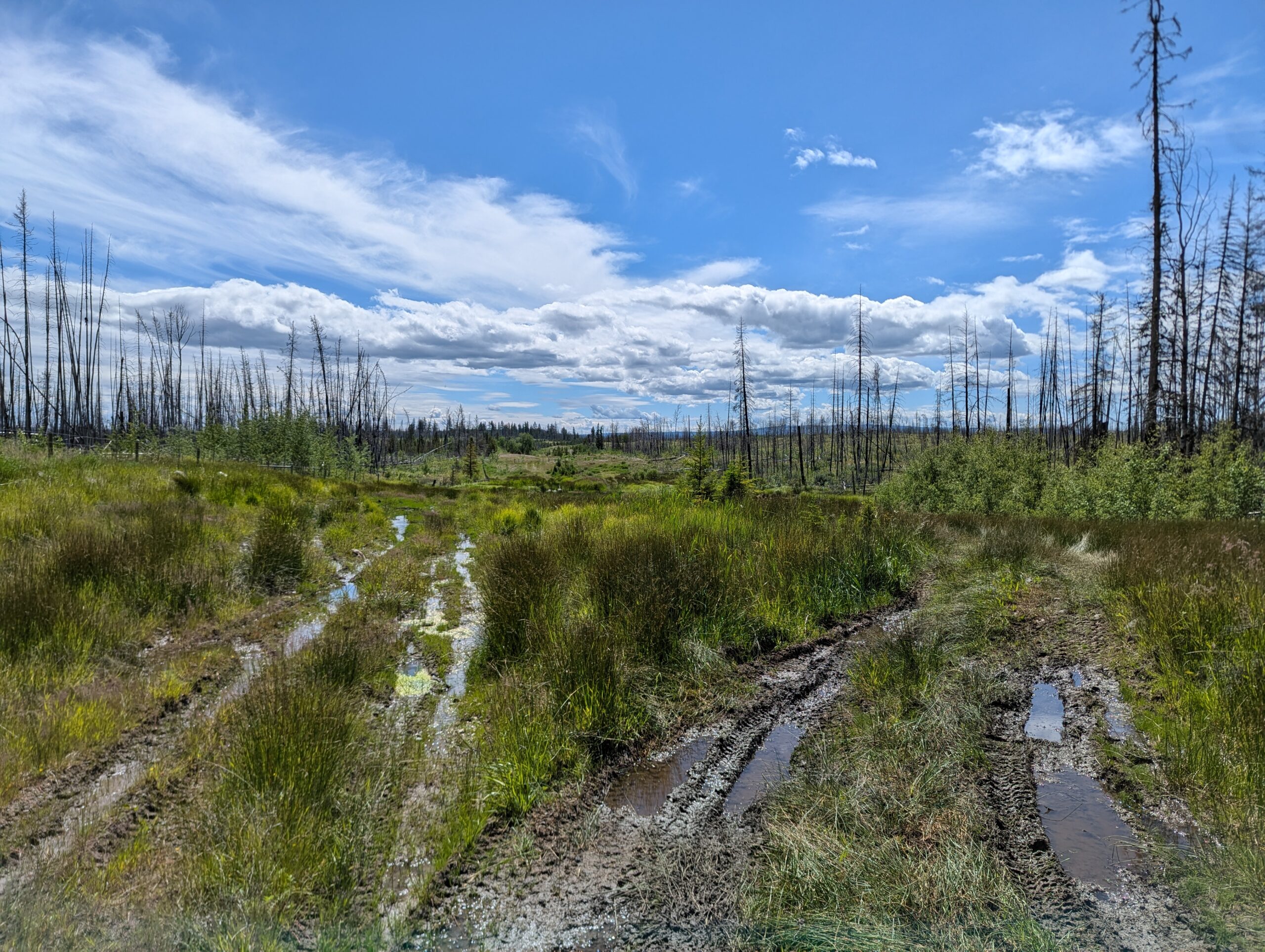I was stopped almost in my tracks, but was able to chug through and continue. The road dried entirely for a while, and other than another bear sighting (this one definitely a lone black bear far up the road) there wasn’t anything concerning until about kilometer 9, when I hit a bigger, even nastier-looking section of bog. Figuring if I hit mud twice so far it was pretty likely I’d hit it again, so just like the snow in Idaho I decided the wise move was to turn around.