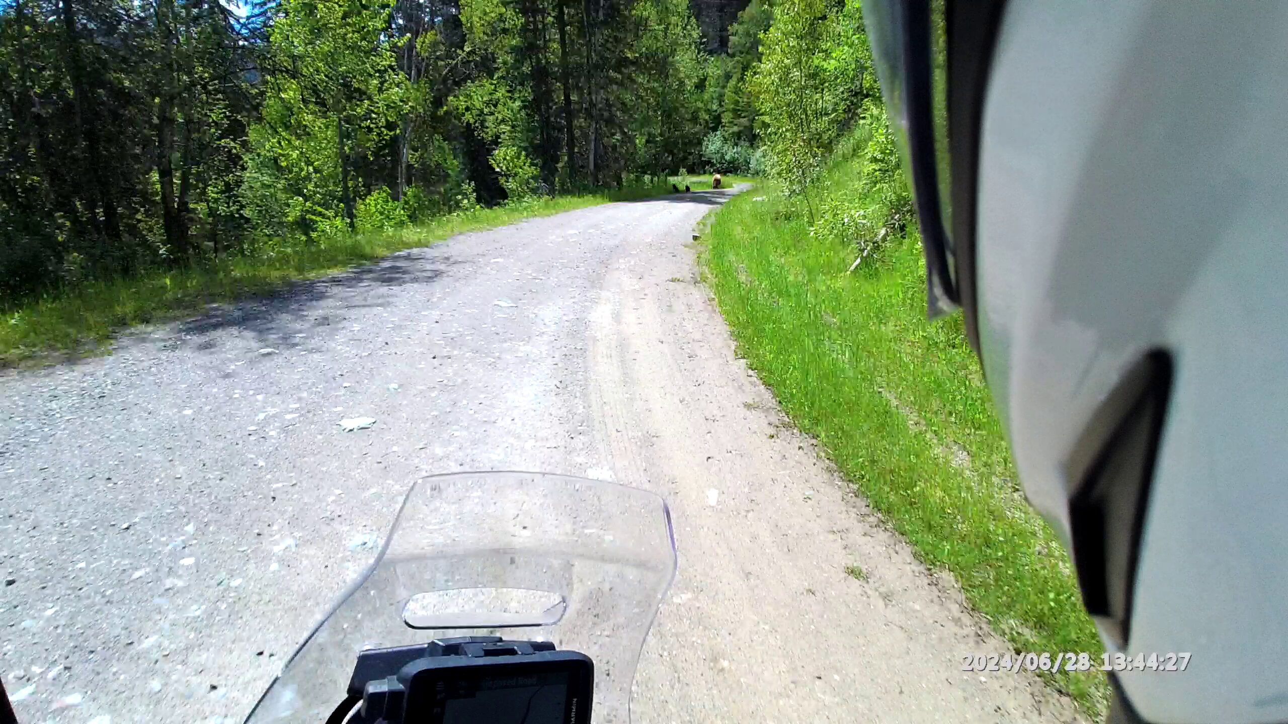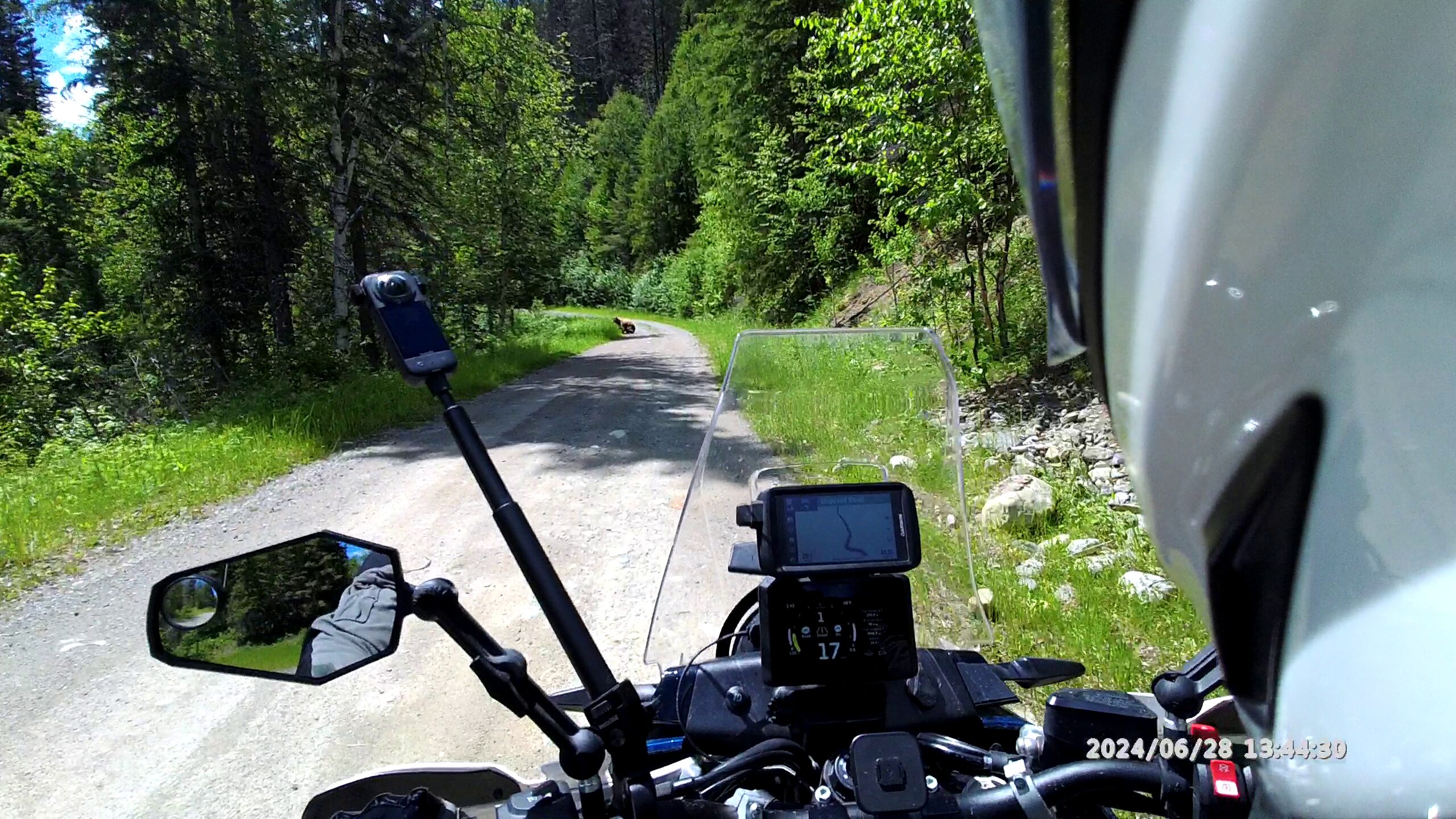 I was loving the riding when I turned a corner to see a big brown mama bear (grizzly if I had to bed, but not totally sure). and her two cubs barreling down the track (thankfully going the same way I was). While the kiddos jumped into a tree just beside me, mama continued running down the road, looking over her shoulder a few times to make sure the cubs were safe. I didn’t feel safe turning my back to go the other way since the cubs were right next to me, so I did the only thing I could think to do: get on the gas, honk the horn, and try to just blow past her. Since the cubs were safe in the tree I figured she’d let me pass and go back for them.