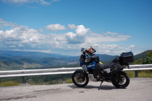 The hard section wound its way up some tight mountain switchbacks with great views — while it wasn’t the most technical riding in the word, it was definitely pretty rocky and fairly steep and I can see why it isn’t in the main route. As I neared the crest of the ridge, I felt the rear end of the bike get super loose and had increasingly angry warnings of “Low Pressure” and “No Pressure” flash on the display. I found a good, level stopping place and starting pulling out my tire kit to fix the puncture only the realize the full extent of my predicament: while I could plug the half-inch gash in the tread, the tire had come completely off the bead and there was no way I could get it reseated with the tools I had.