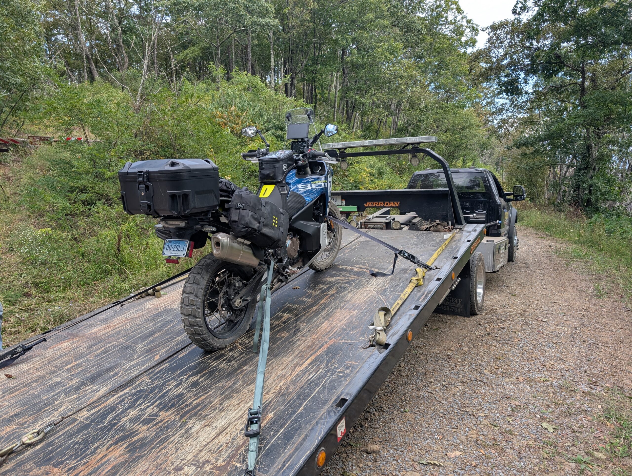 I lucked out a bit and some signal at the top of the crest, which I was able to use to arrange a tow and a tire swap in the closest shop I could find. The track I was on was about the width of the flatbed and it took the driver about an hour to climb the mile of switchbacks to get to me, but we managed to get to the shop and I got the tire installed just before they closed the doors for the evening. Sadly, Trailmax Missions were the most aggressive tire they had, but at least I was able to carry on and booked myself a hotel room close enough to the route to continue the next day.